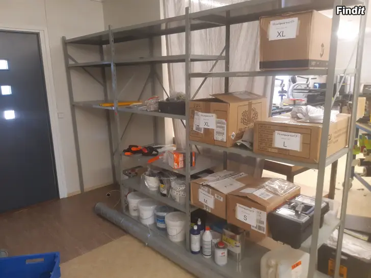 Bildens lagerhylla i plåt, längd 3m höjd 2m, djup på hyllorna är 50cm, 17 st hyllor finns.