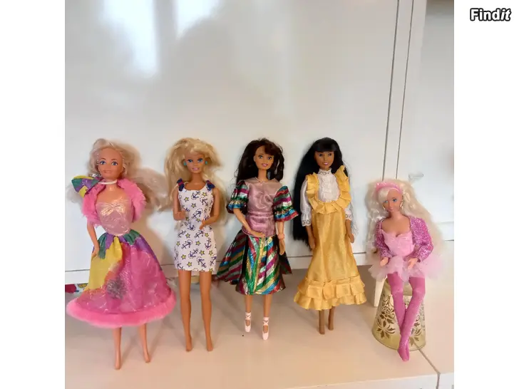 5 barbiedockor, bl.a. Pochahontas originalkläder finns, Ballerina m.fl. Lite kläder och tillbehör medföljer. Den längst till vänster är skadad och saknar en arm, men följer gärna med i alla fall. Pris 10 e för alla tillsammans.