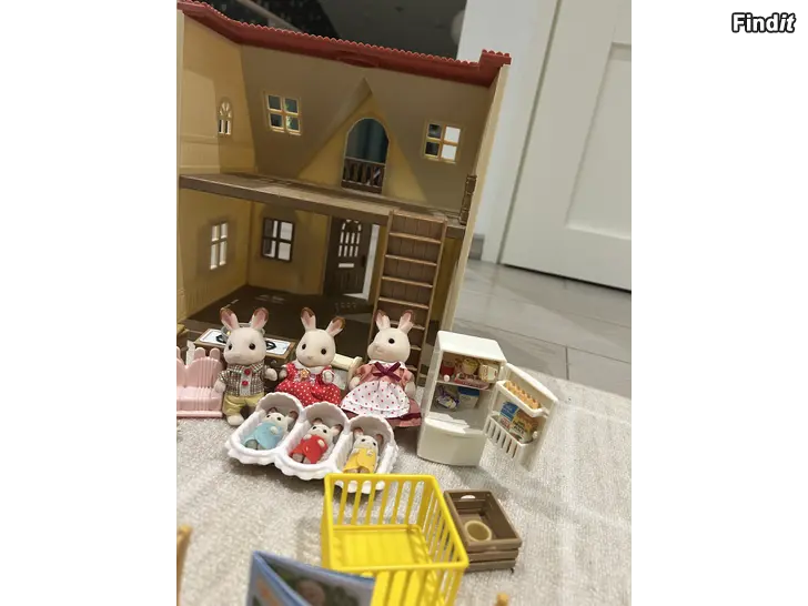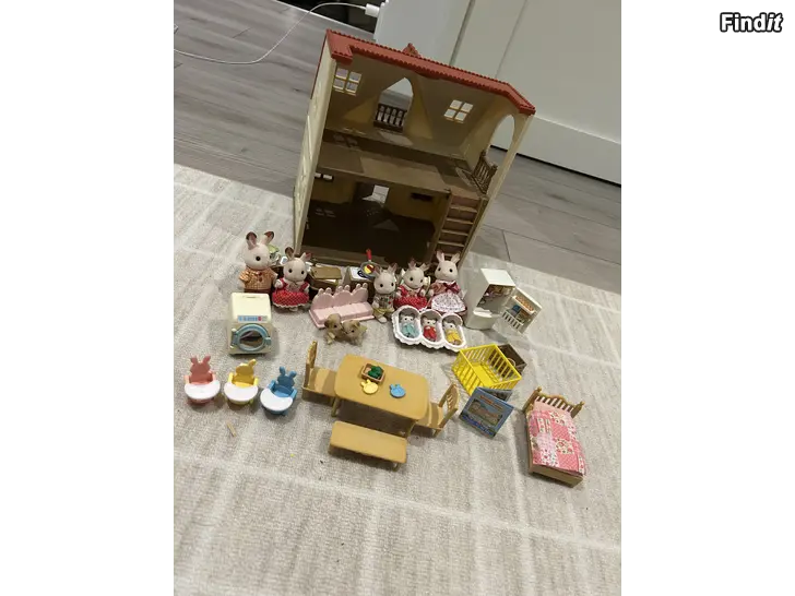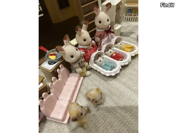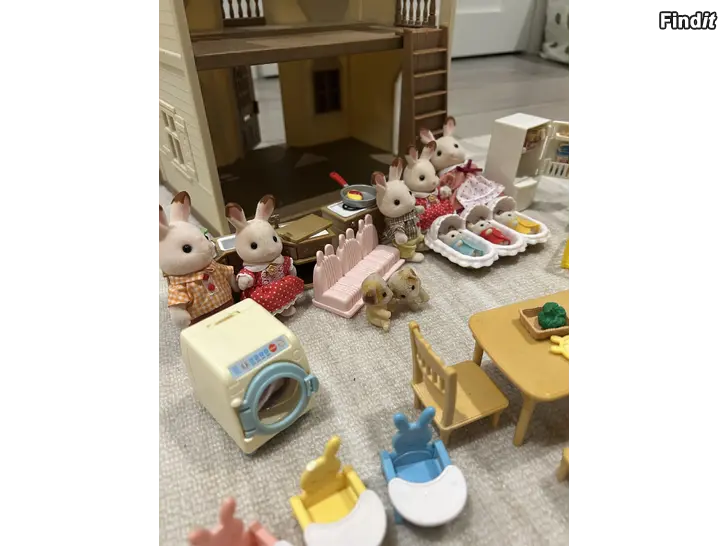 Stort set med Sylvanians: hus, kaninfamilj, trillingar med tillbehör, kök, tvättmaskin, hundvalpar