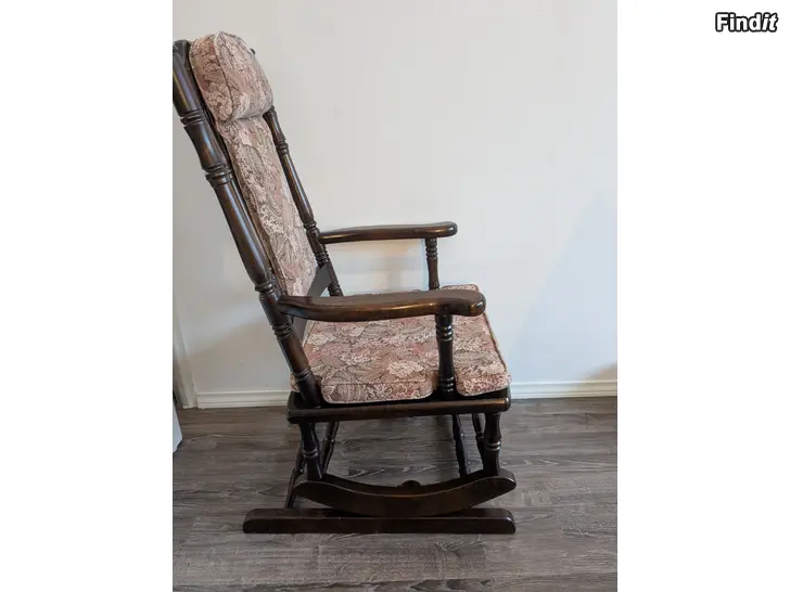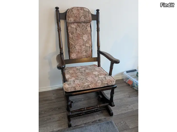Säljes inhemsk gungstol med fjäder, lämplig för äldre personer. Såkallad amerikansk gungstol. Gungstolen är tillverkad av keinukaluste Seppo Saari, Urjala Finland. Stolen är i mycket bra skick, tyget är helt och fästen förnyde. Väldigt bekväm, sitthöjd cirka 45 cm. Nås på telefon. Myös suomeksi.