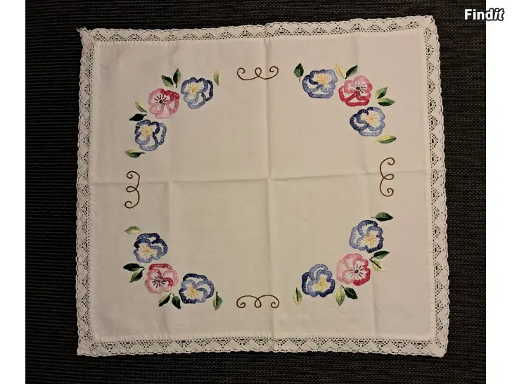 Kirjailtu pöytäliina pitsireunuksella, koko 45 x 48 cm.