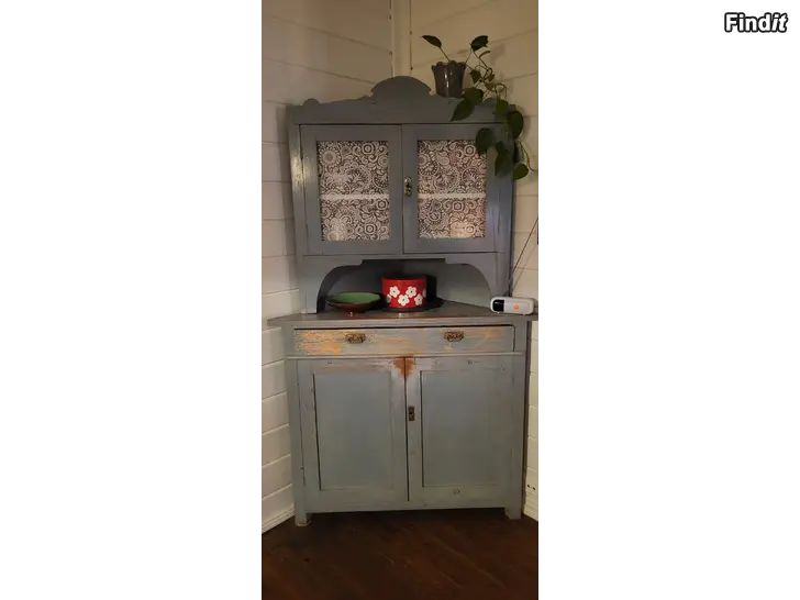 Hörnskåp med patina säljes, helträ. Finns inga glas i övre delen men går att lägga. Finns en nyckel.