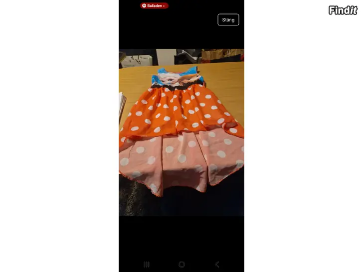 Säljer en söt klänning med motiv från Frozen på överdelen och volangkjol i orange och rosa med vita prickar. Klänningen har ärmlös design och rund hals. Perfekt för dig som älskar Disney och färgglada plagg!