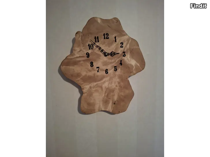 Väggklocka gjord av björkvril, quartz urverk visare 7,5 / 5.0cm. Största bredd på klockan 32cm, största höjd 37cm