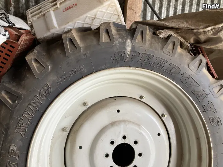 Däck speedways 14.9-38 i gott skick inklusive fälg med 8 bulthål 20 mm, 80 mm från varandra, diameter på bultcirkeln ca 200 mm och centrumhål 140 mm. Har använts åt en New Holland 6640.