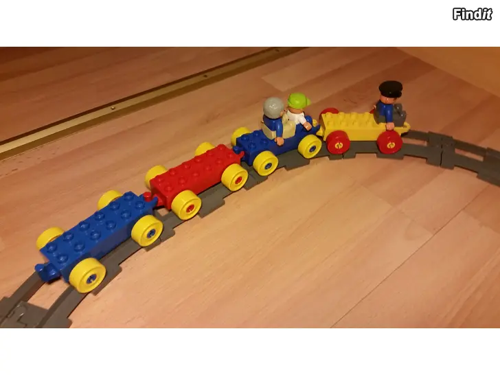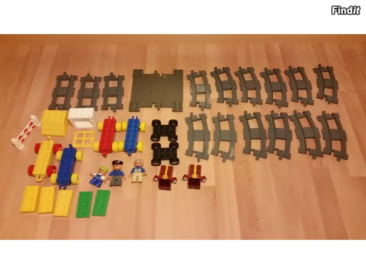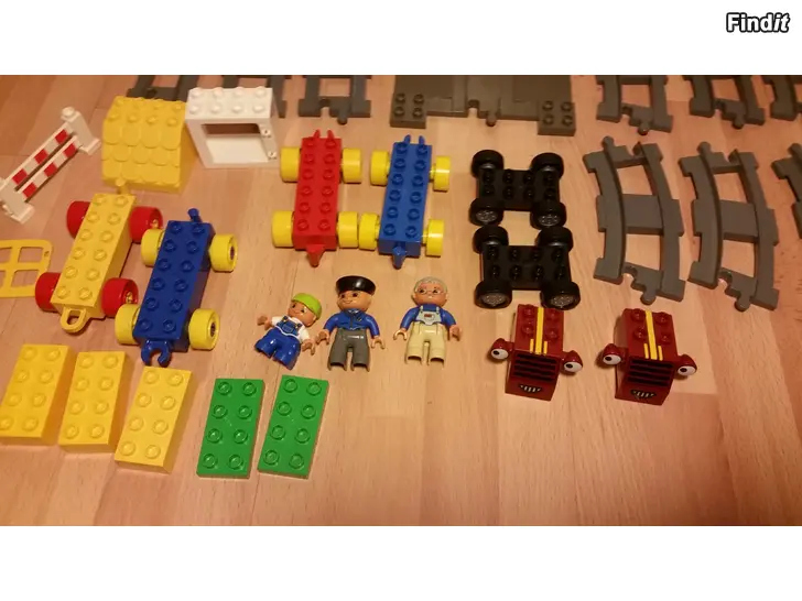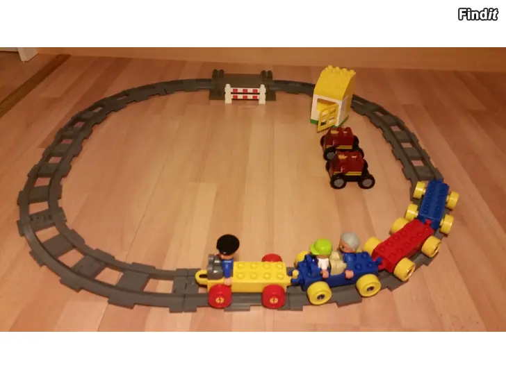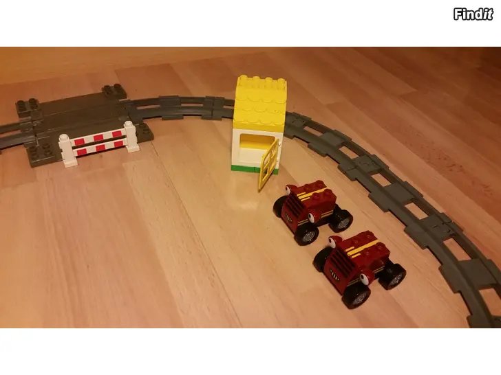 3 ukkoa, 4 vaunua, 2 autoa, puomi, rakennus, asemaseisoke ja 15 rataosaa