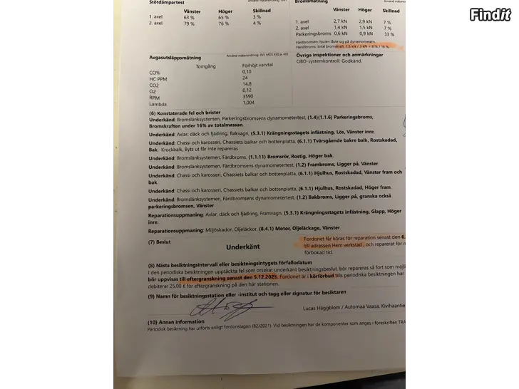 Säljes som obesiktad gick inte igenom besiktningen, bild på felen