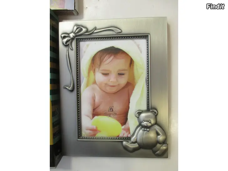 Uusi, nalle- ja rusettiaiheinen metallikehys, joka on tinapinnoitettu ja mattalakattu.