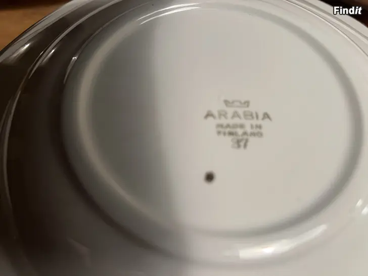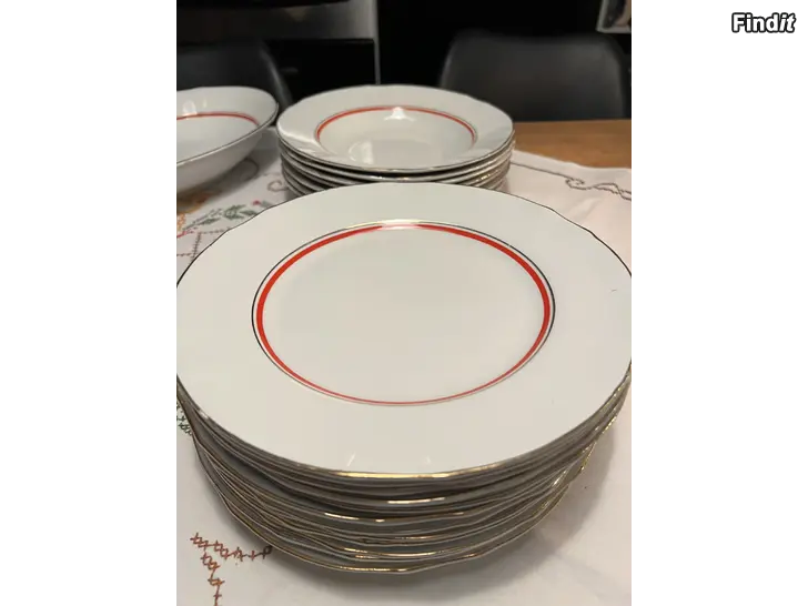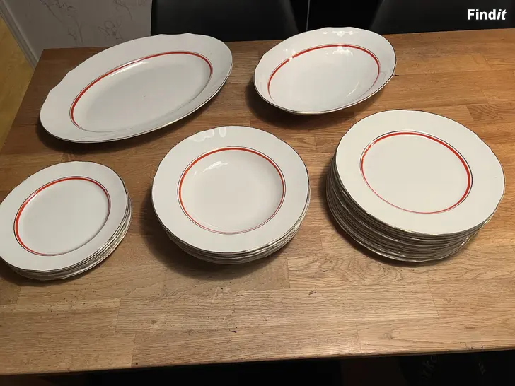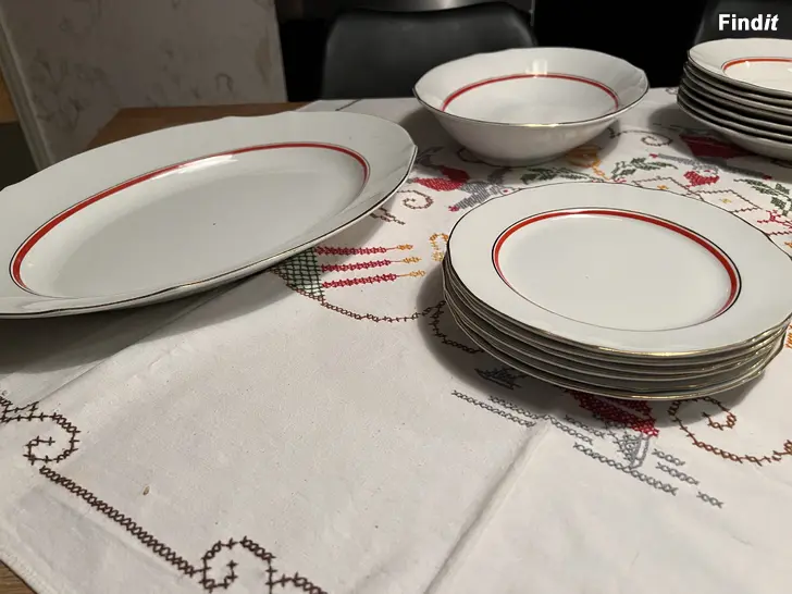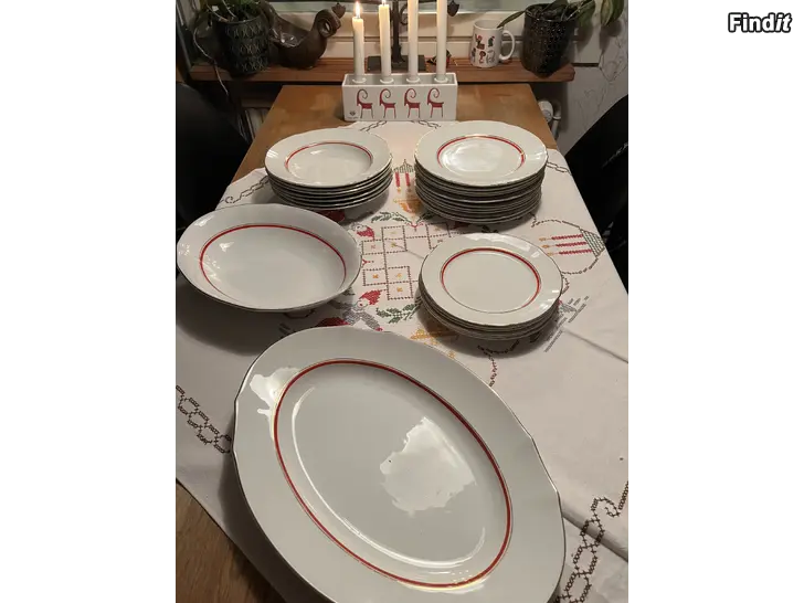 Arabia matservis tillverkad 1947-64. Väldigt bra skick. 11 flata tallrikar, diam 23,5 cm, 7 sopptallrikar diam 23,5 cm, 6 assietter diam 20 cm, 2 serveringsfat. Julens färger!!