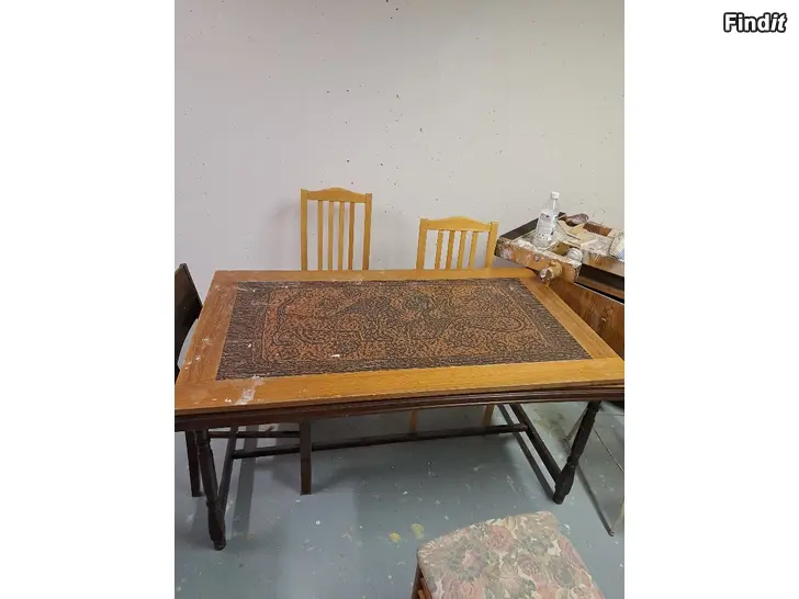 Matbord och 3 stolar. Bordsskivan har några fläckar.