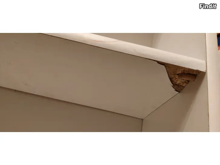 Bokhylla av spånskiva. Mittersta hyllan har gått sönder och blivit svängd upp och ner.