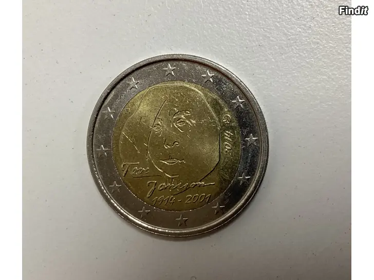 Kirjailija, kuvittaja, sarjakuvapiirtäjä Tove Janssonin 100-vuotisjuhlan kunniaksi julkaistu erikoisraha. Hänet tunnetaan parhaiten Suomessa ja muualla maailmassa Muumeista.