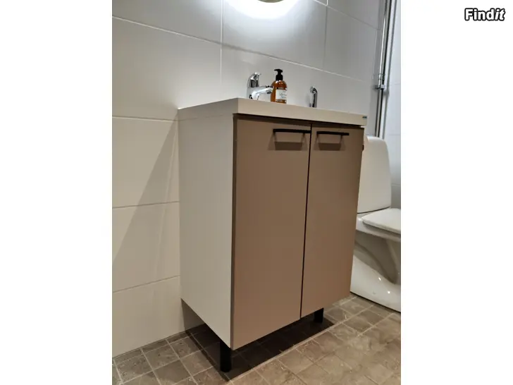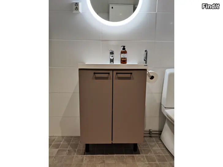 Ett 60cm brett tvättställ med svarta handtag och dörrar i färgen Hiekka, en rund spegel med led, och Oras kran med handdusch.