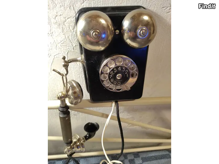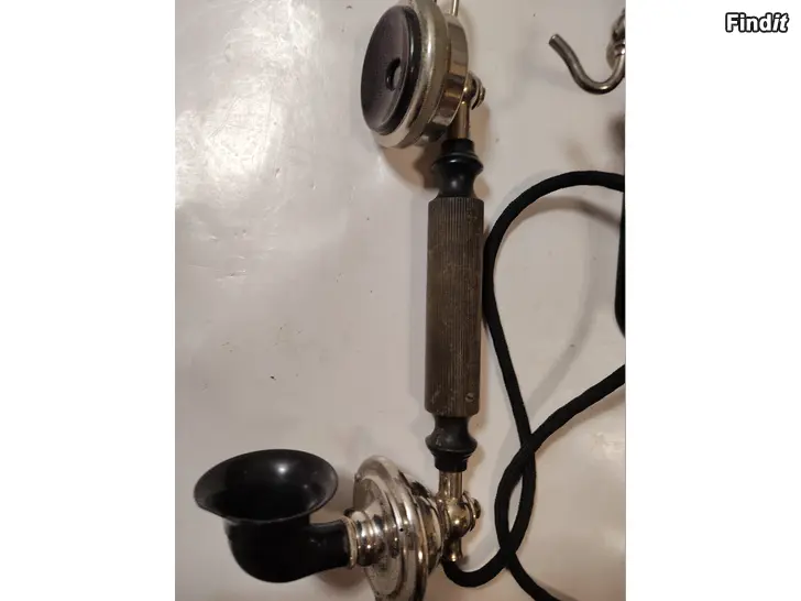 Mustaksi emaloitu metallikotelo. Mustaksi maalattu puinen luurin kahva.