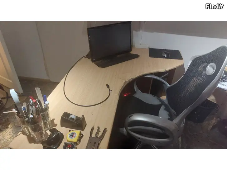 L-format skrivbord i storleken ca 155×110 cm. Stabil konstruktion, gott om arbetsyta. Tydliga bruksspår och slitage i bordsskivan se bilder. Passar bra som arbetsbord, hobbybord eller kontor.