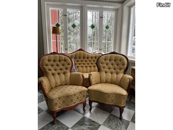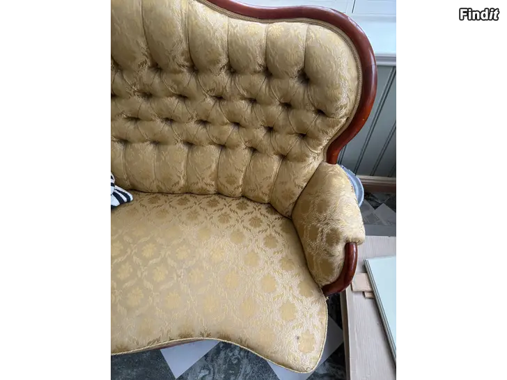 Nu säljer vi vår fina soffgrupp p.g.a. att den tyvärr inte hittar sin plats hos oss. Soffan har en mindre mörk fläck men i övrigt är alla delarna i väldigt bra skick och bekväma att sitta i. Köpta som helhet i Sverige och säljes nu också tillsammans.