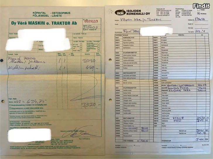 Edellinen omistaja teettänyt täydellisen kone ja kytkinremontin, tästä löytyy kuitit, hän sanoi ajaneensa remontin jälkeen max. 20h ja itselleni ei ole tullut koneeseen yli 10h, valitettavasti tuntimittari ei pyöri.