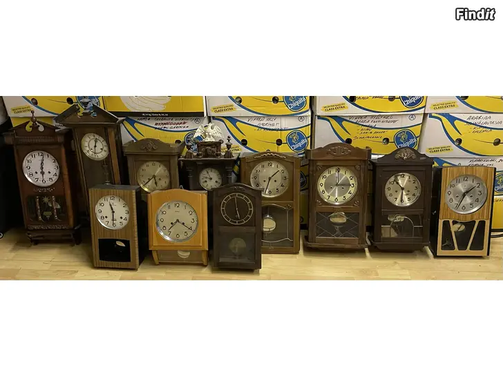 Myydään kuvan mukainen erä vanhoja seinäkelloja. Kelloja on yhteensä 11 kpl.