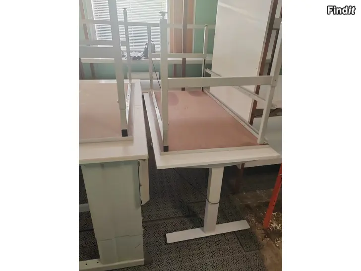 Erilaisia isoja metallirunkoisia työpöytiä säädettävällä korkeudella.