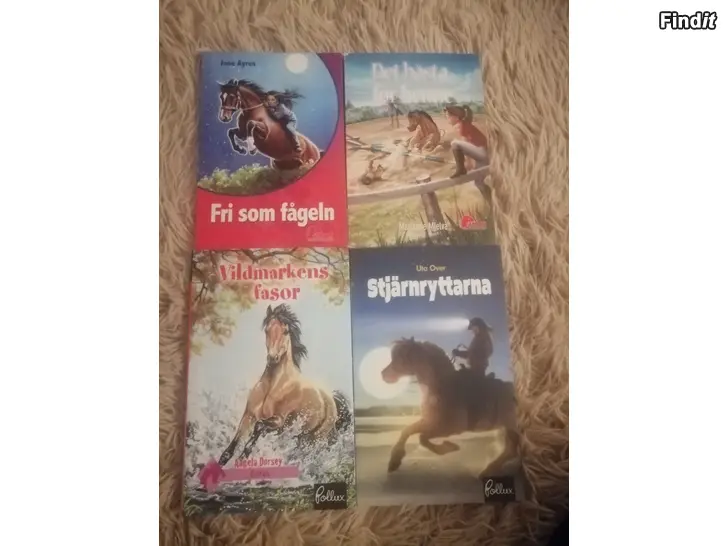4 stycken Pollux böcker på svenska och är bra i skick och det heter FRI SOM FÅGELN, DET BÄSTA FÖR HENNE, VILDMARKENS FASOR och STJÄRNRYTTARNA