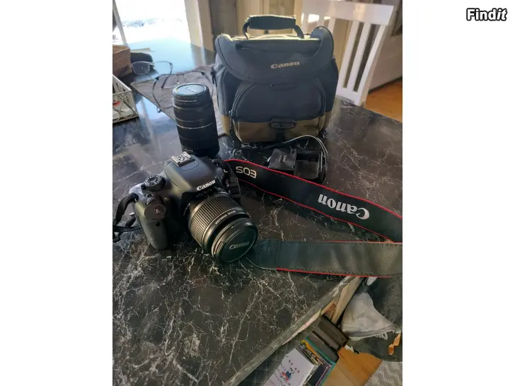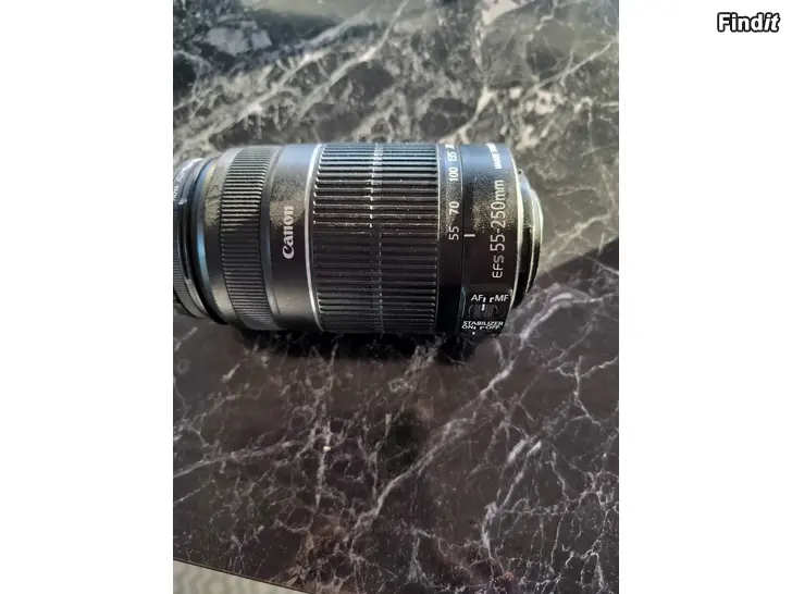 Canon system kamera med extra objektiv EFS 55-250mm . Väska ,laddare,usb kabel. Sparsamt använd.