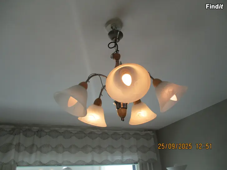 TAKLAMPA 5-armad med vackra frostade kupor och LED- ljuslampor installerade. Helt i nyskick. Takstöpsel med, men kan även anslutas till gammaldags direktkoppling. Mått diameter 60cm, höjd 40cm + taklänk 40cmställbar. PRIS 30 €.