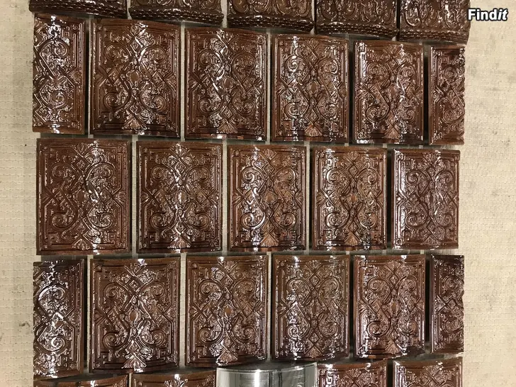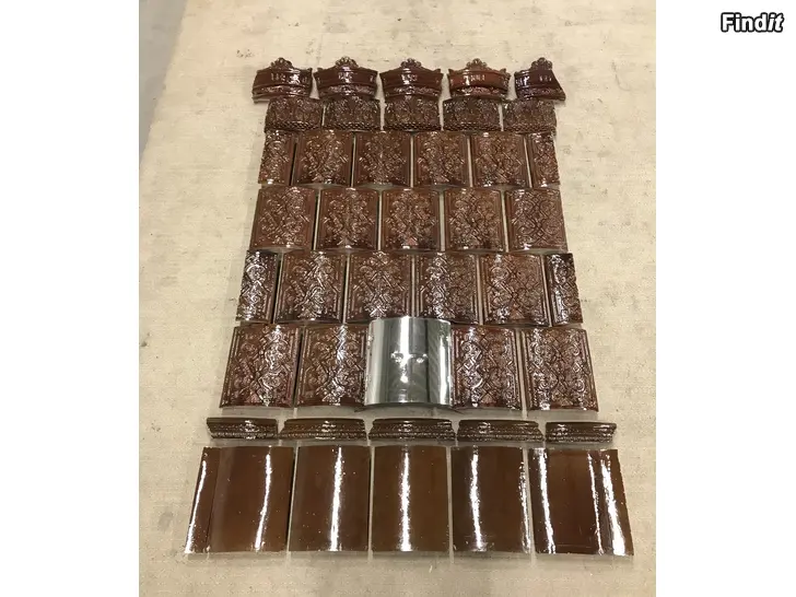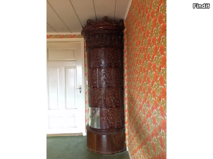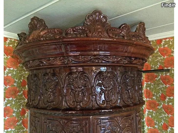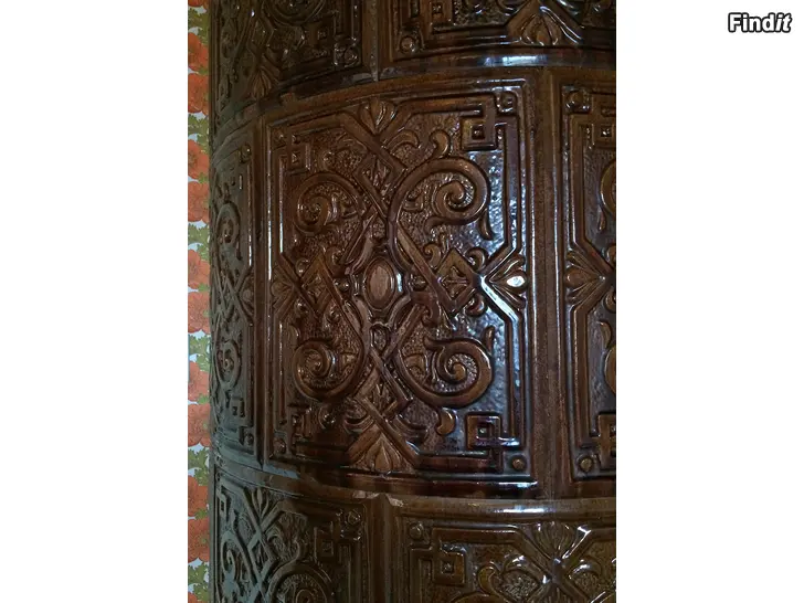 Rund mörkbrun kakelugn med fantastiskt fin glasyr, elegant ornamentik och ett vackert krön. Släta kakel i sockeln. Kakelugnen är tillverkad ca. 1895. Ugnen har förnicklade silverfärgade eldstadsluckor. Denna kakelugn är avsedd för montering i hörn, men kan även anpassas för att stå mot en rak vägg.