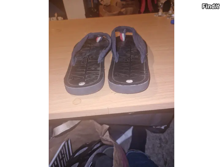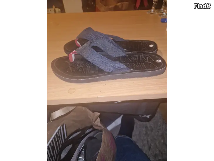Säljer ett par svarta flip-flops från Wave California med breda blå tygband och en detalj i rött, vitt och blått framtill. Sulan är svart med präglad logga och banden är mjuka för extra komfort. Perfekta för sommardagar och strandhäng.st 43