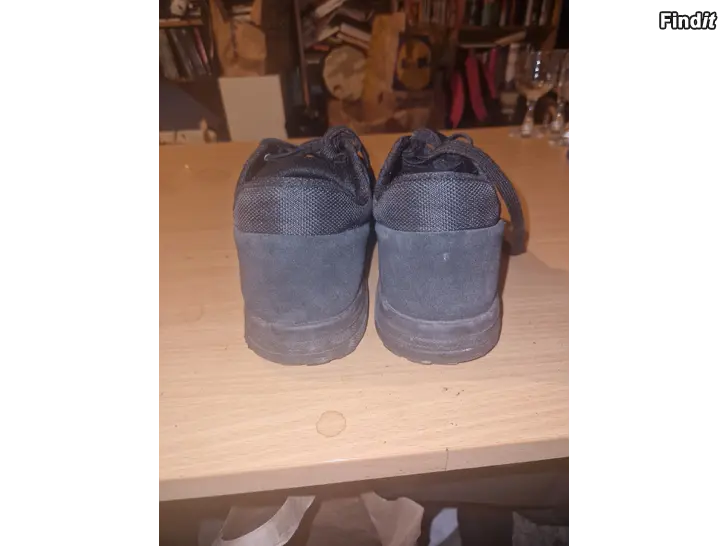 Säljer ett par helsvarta sneakers med ovandel i mocka och textil. Skorna har klassisk snörning och platt sula, samt diskreta perforeringar på sidan för extra stil. Perfekta för dig som gillar en clean och enkel look.