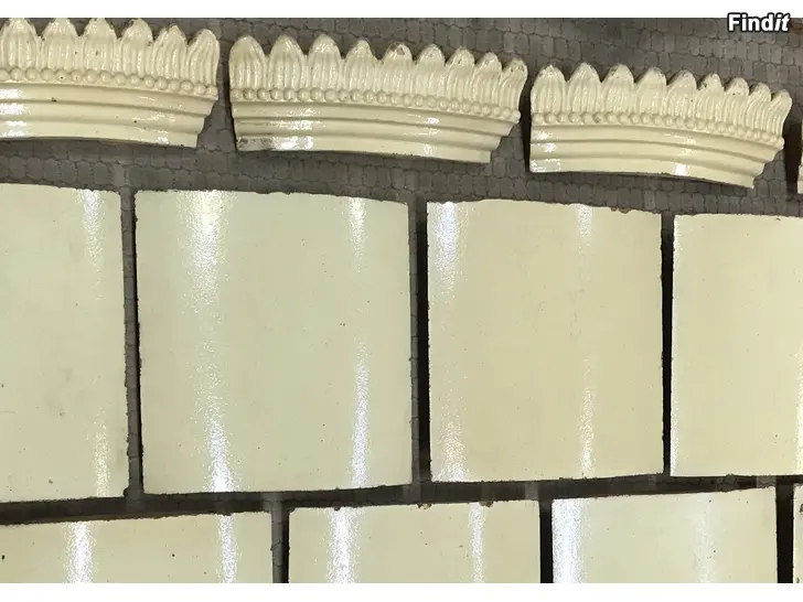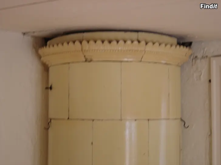 En fin rund honungsfärgad hantverksugn med släta kakel, tillverkad ca. 1850. Kakelugnen hade tidigare övermålad sockel, färgen har nu avlägsnats och ugnen levereras med oglaserad sockel i originalskick se bilder på kakelugnen utlagd. Taggigt krön och vackra ornament i fotsimsen. Kakelugnen har eldstadsluckor i plåt och inre sotluckor i gjutjärn. Denna kakelugn är avsedd för hörnmontering, men kan även anpassas för att stå mot en rak vägg.