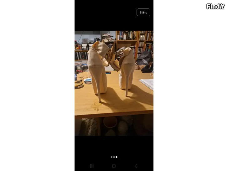 Säljer ett par beige pumps från Nelly med riktigt hög klack och plattform. Skorna har en rund tå och är gjorda i mocka-liknande material. Runt ankeln sitter en bred, glansig guldfärgad detalj som ger extra edge. Perfekta för dig som vill sticka ut med stil.st 36