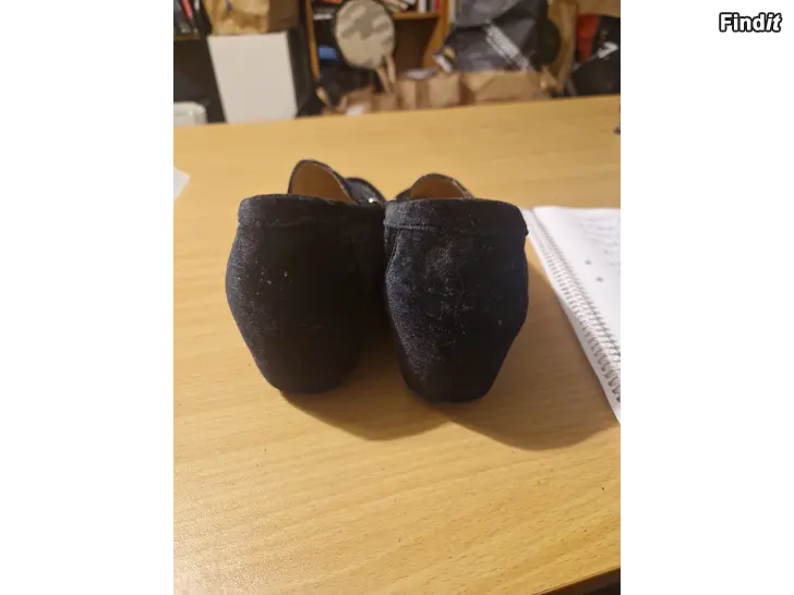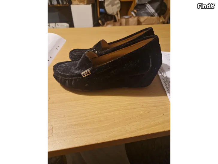 Snygga svarta loafers i mjuk mocka med kilklack och dekorativt guldfärgat metallspänne på sidan. Skorna har en klassisk rund tå och är perfekta för dig som vill ha både stil och komfort.st 37