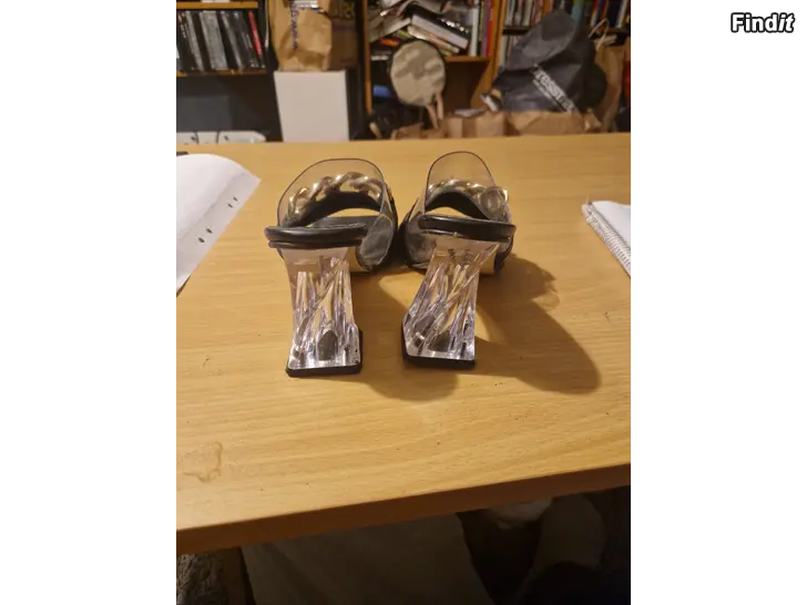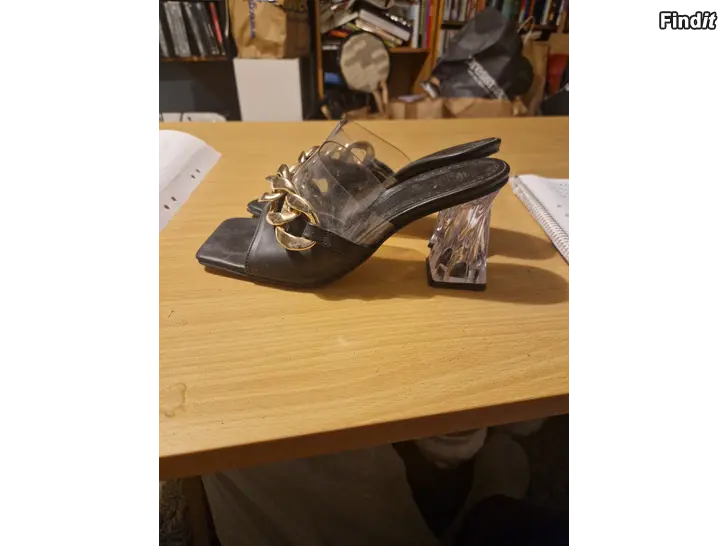 Säljer ett par svarta sandaler med fyrkantig tå, bred transparent rem och chunky guldfärgad kedjedetalj framtill. Klacken är hög och gjord i transparent plast med coolt mönster. Perfekt för dig som gillar statement-skor med unik design.st 37