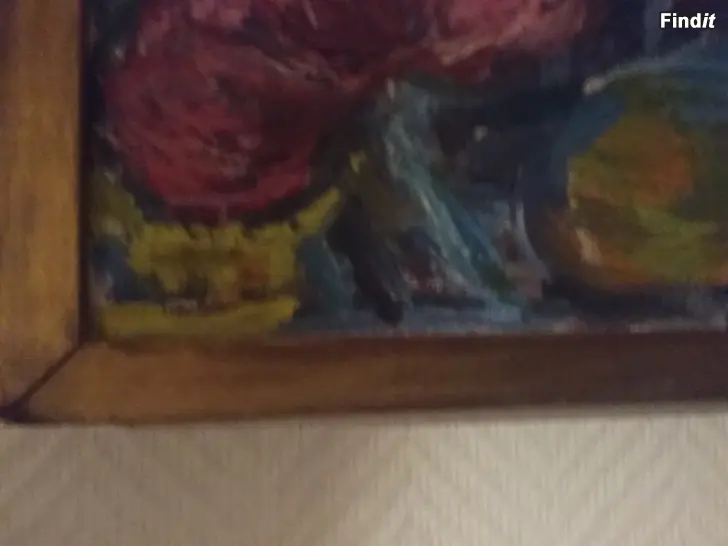 Värikäs ikään kuin kukkamerta kuvaava öljyvärityö kankaalle, signeeraus epäselvä. Tekoajankohta ilmeisesti 60/70 lukua