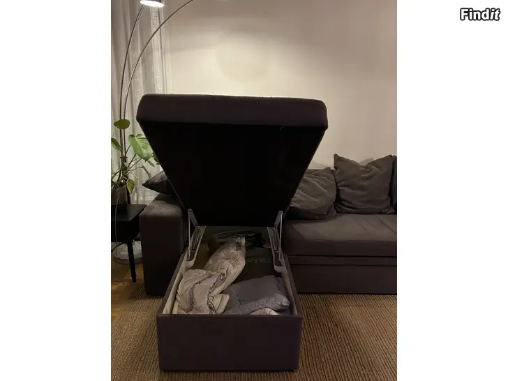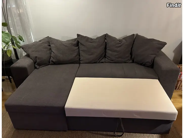 Grå bäddsoffa med divandel och förvaring. Har en del skavanker men den har alltid förvarats inomhus. Bredd 252cm djup 84cm och divan 150cm.