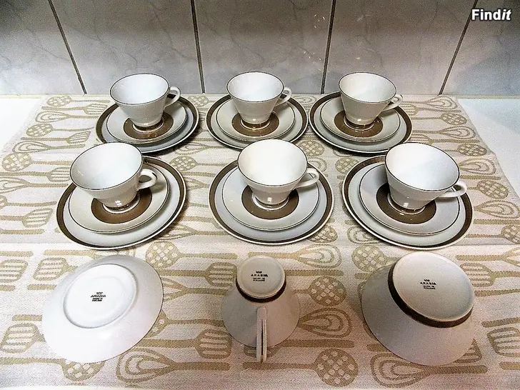 6 kpl kuppeja, 6 kpl lautasia, 6 kpl pullalautasia sekä sokerikko ja kermakko.