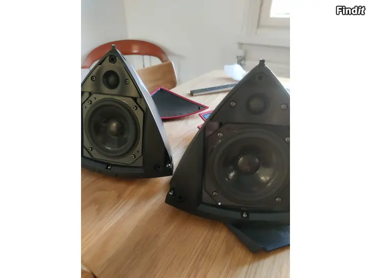 Bang & Olufsen Beolab 4 aktiivikaiuttimet omalla jalustalla. Tehtaan pakkaus löytyy. Yhdessä kankaassa pieni repeytymä takapuolella, mutta se ei edestäpäin näy kuva 3.