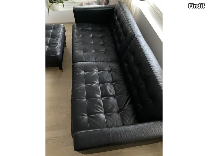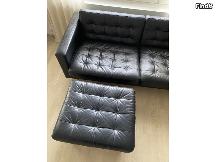 Svart läder 3-sitssoffa med träben och tillhörande fotpall i bra skick.