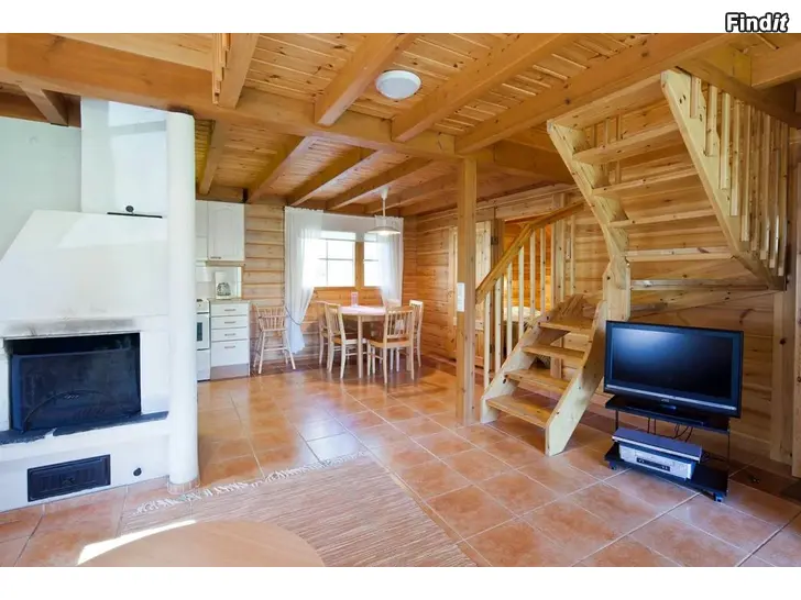 Lamellihirsinen erillistalo, jossa olohuone, 1 makuuhuone alakerrassa ja toinen parvella, keittiö, sauna, kylpyhuone, wc, terassi ja parveke