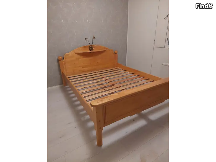 Täyspuinen parisängyn runko ja siihen kuuluvat lamput.