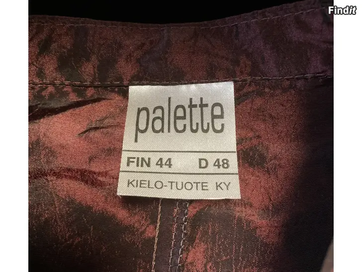 Säljer blusen på bilden. Märke Palette, Kielo-Tuote ky. Storlek 44. Material 60 polyester och 40 polyamid. Har axelvaddar, men dom kan enkelt tas bort om så önskas. I mycket bra skick. Finns i Vasa. Kan postas mot portokostnad.