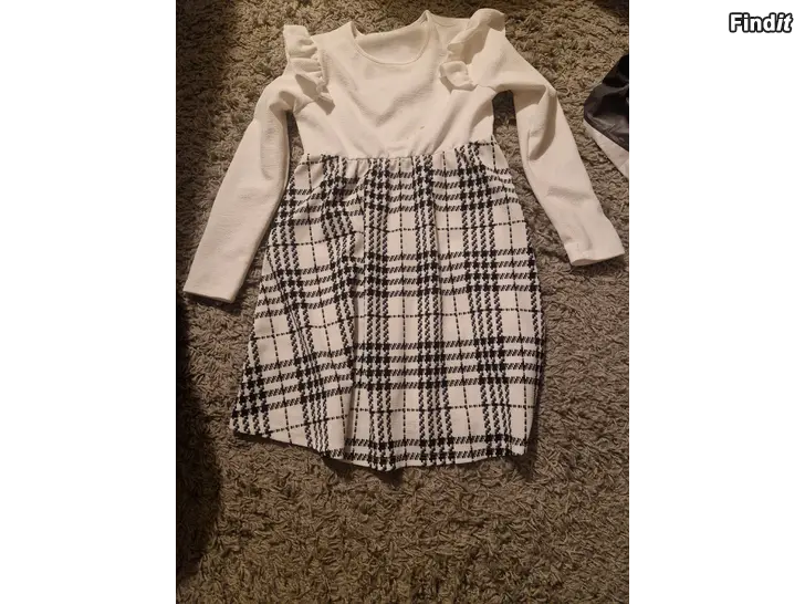Säljer en söt vit och svart klänning med långärmad överdel och volangdetaljer på axlarna. Kjolen har ett klassiskt rutigt mönster i svart och vitt. Perfekt för dig som gillar stilrena och trendiga plagg med lite extra detaljer.