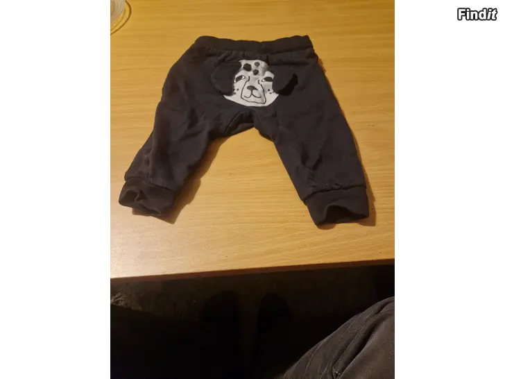 Svarta mjukisbyxor i bomull med snörning i midjan och ribbade muddar vid bensluten. På baksidan finns ett sött hundansikte med öron i tyg, vilket ger en lekfull touch. Perfekta för chill dagar och har en mjuk och skön känsla.