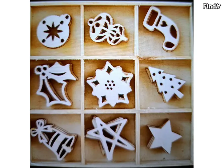 Rasia puukoristeita, rasian koko 4 x 4 cm, hinta 7e