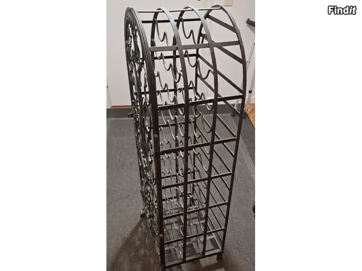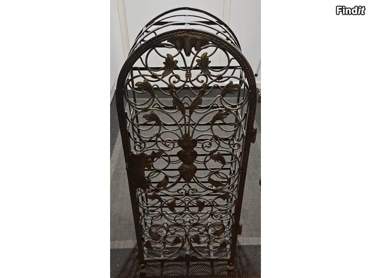 Antikt tungt vinskåp av järn i gammal grön nyans. HxBxD 125x50x34 cm.Plats för 45 vinflaskor. Finns i Jeppis