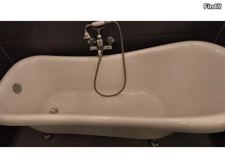 Vitt badkar medföljer väggmonterad vattenblandare med dusch