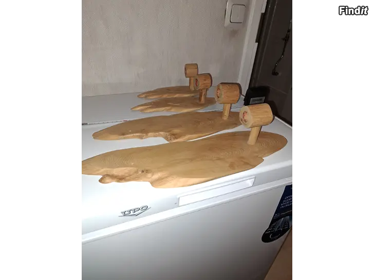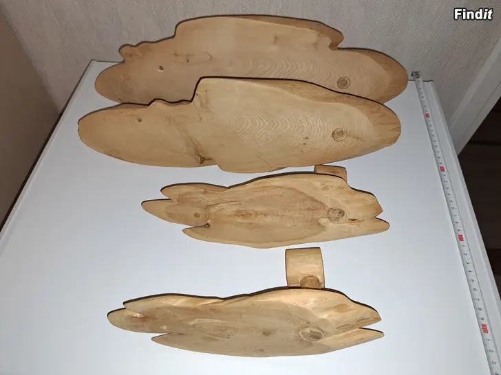 Neljä, puista kynttelikköä. Isoimman mitat 43 x 12 cm, pienimmän 24 x 8 cm. Kaikkien levyjen vahvuus n. 1 cm.