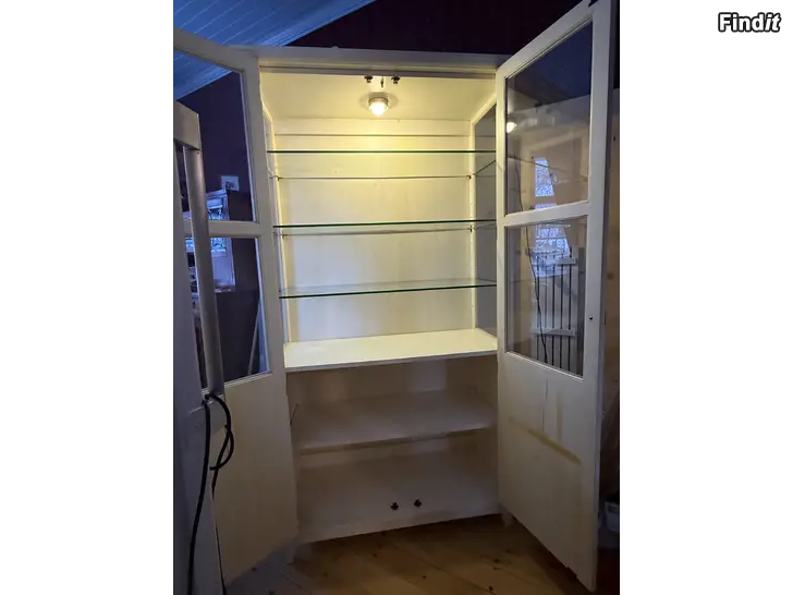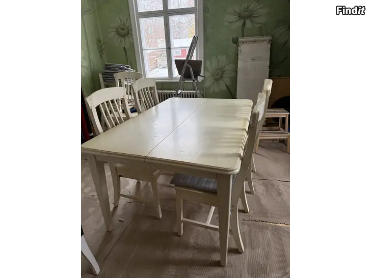 Matbord med 8 stolar. Bordets mått 150x100 och med tilläggs skiva 150x150. Både på bordet och stolarna syns spår av användning. 2 av bordsbenen har sprickor vid fästningsstället syns i bilderna. Vitrinskåpet i bra skick. Säljes tillsammans.