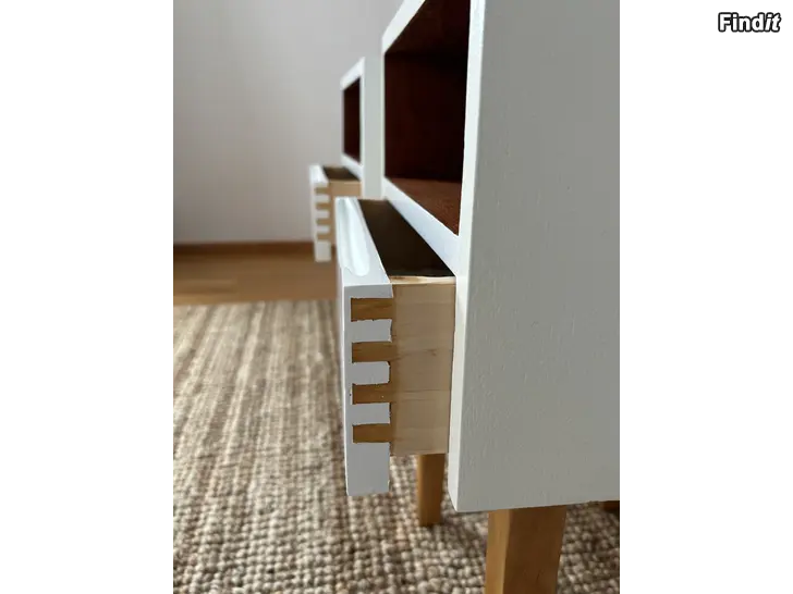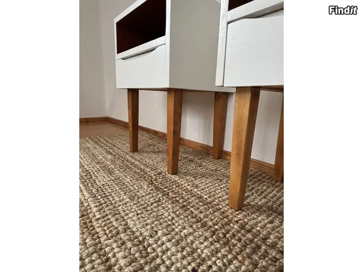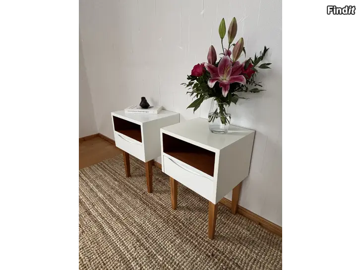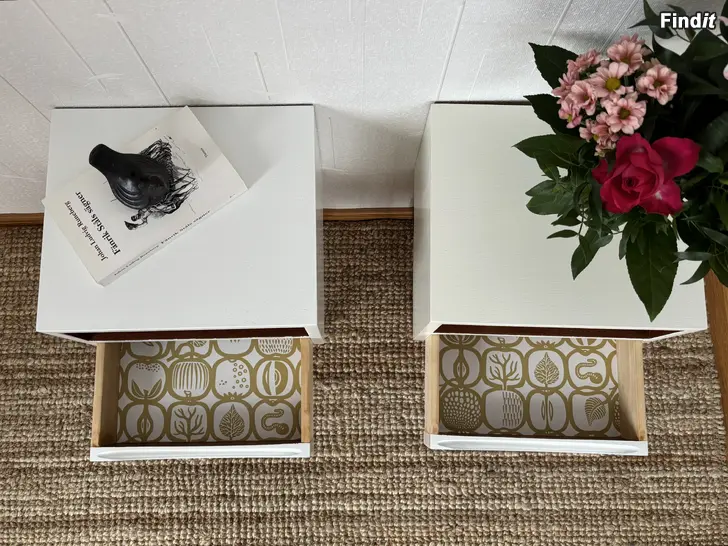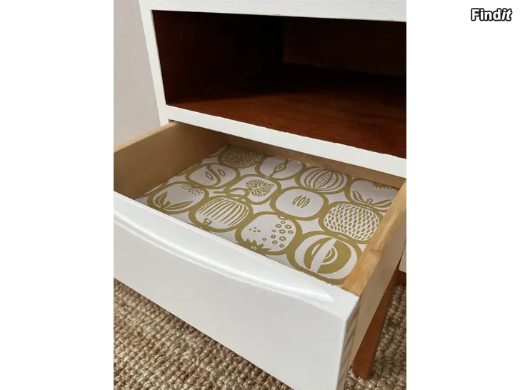 Säljes två renoverade vintagenattduksbord teak från 1960-/70-talet. Stommen är målad med vit Teknos Futura Aqua-färg. Nya filtfötter under fötterna. Stommen är lackerad med Teknos Helo Aqua-lack för ökad hållbarhet. Boråstapeters Fruktlåda-tapet design av Stig Lindberg i botten av lådorna. Säljs inte separat, endast tillsammans.